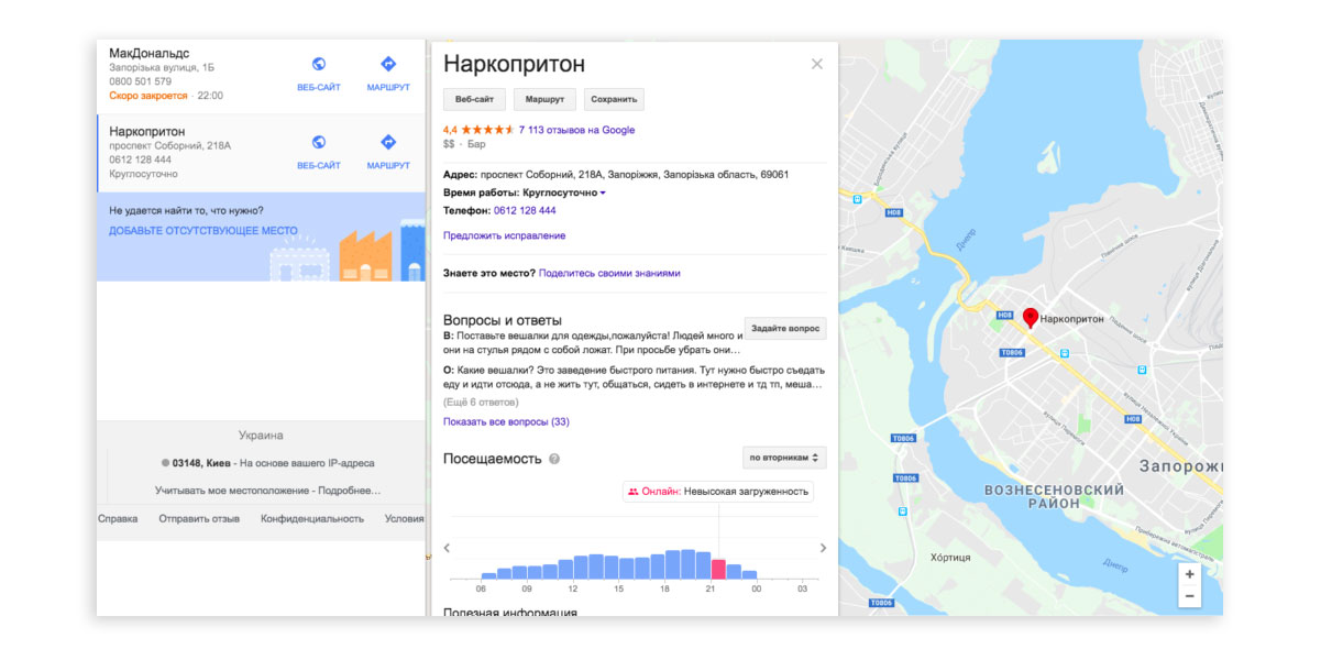 Як бачите, будь-який об’єкт може стати жертвою жартівників або, ще гірше, аферистів. Адже крім «жартівливих» назв користувачі можуть вносити зміни в контактні дані кожної локації: змінювати адресу, телефон, сайт і т.д.