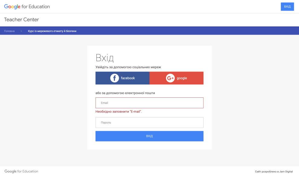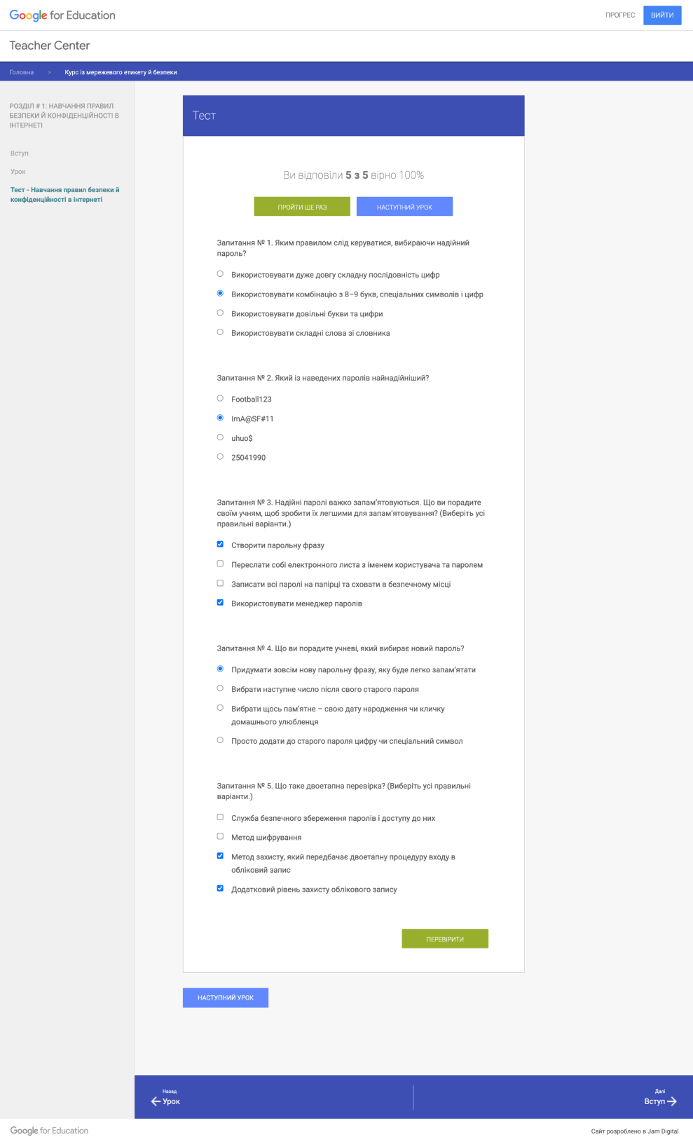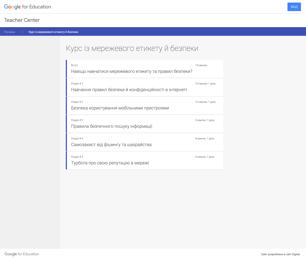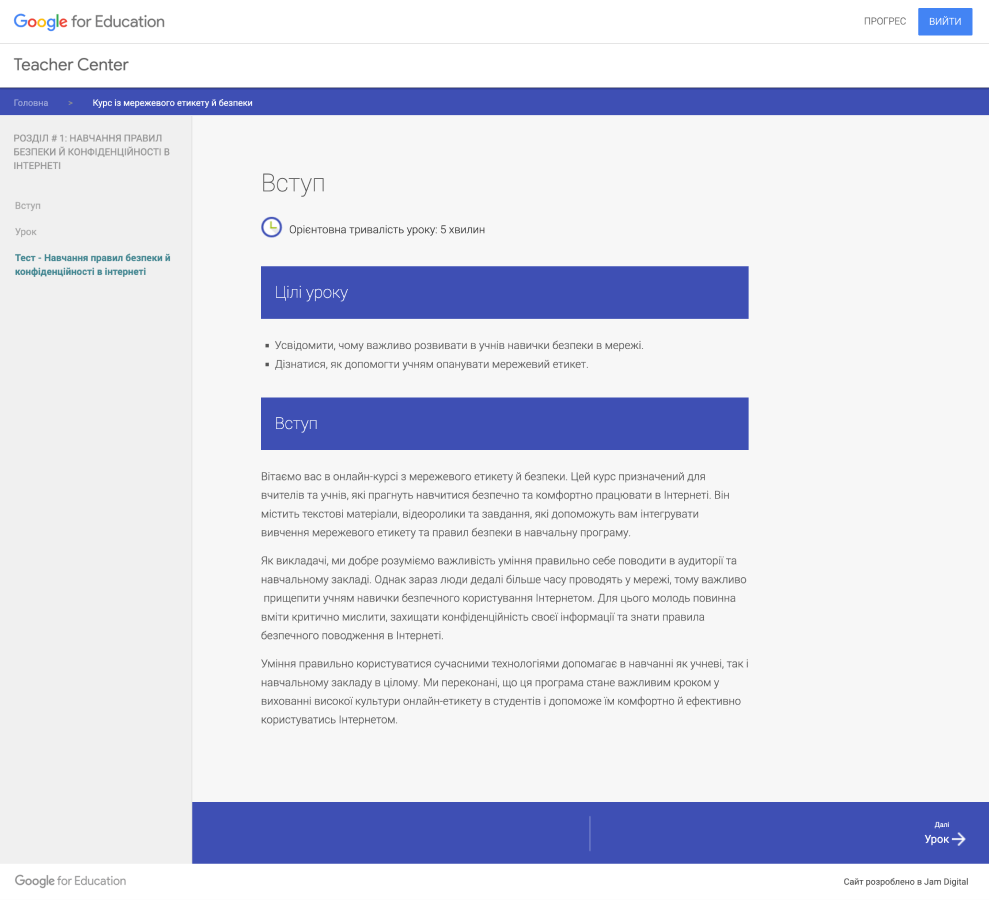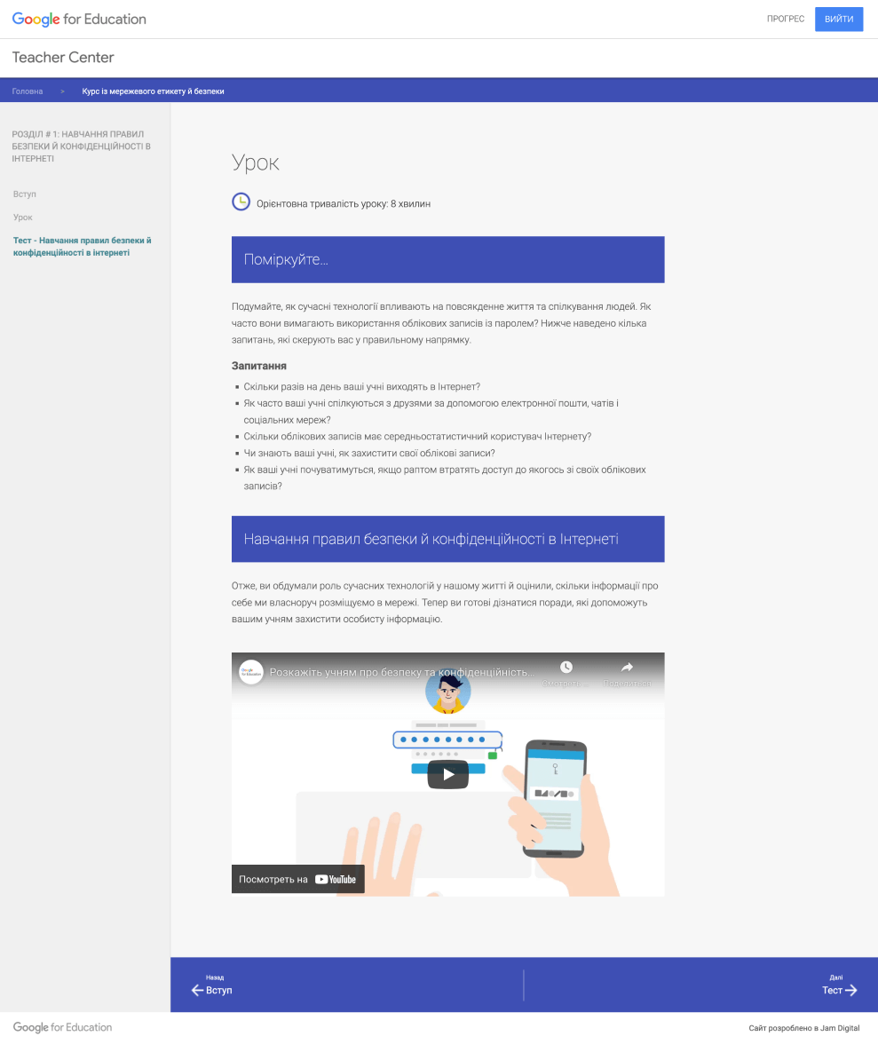 Для онлайн-курсу з мережевого етикету і безпеки для вчителів було розроблено сайт, реалізований на CMS Jam Engine. Інтерфейс сайту створено в стилі навчальних матеріалів Google