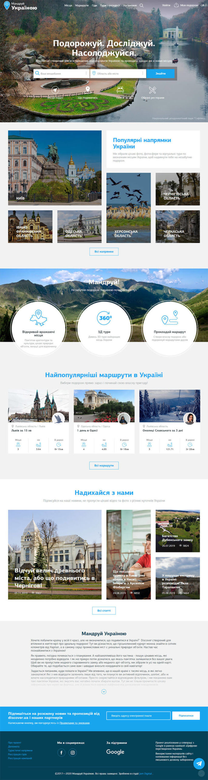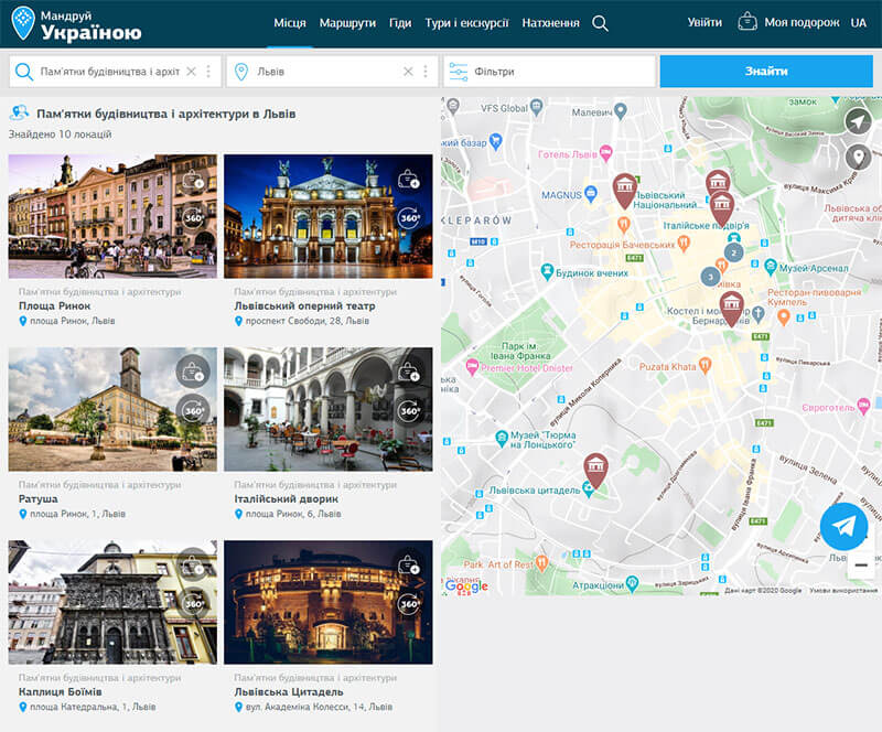 Discover Ukraine — це надійний путівник і досвідчений гід одночасно. Тут зібрані всі значущі пам’ятки і інші цікаві і незвідані локації України. Ви не просто прочитаєте опис і побачите їх у 3D, але і зможете прямо на сайті прокласти власний маршрут і розрахувати витрачений на дорогу час завдяки інтеграції з Google Maps.