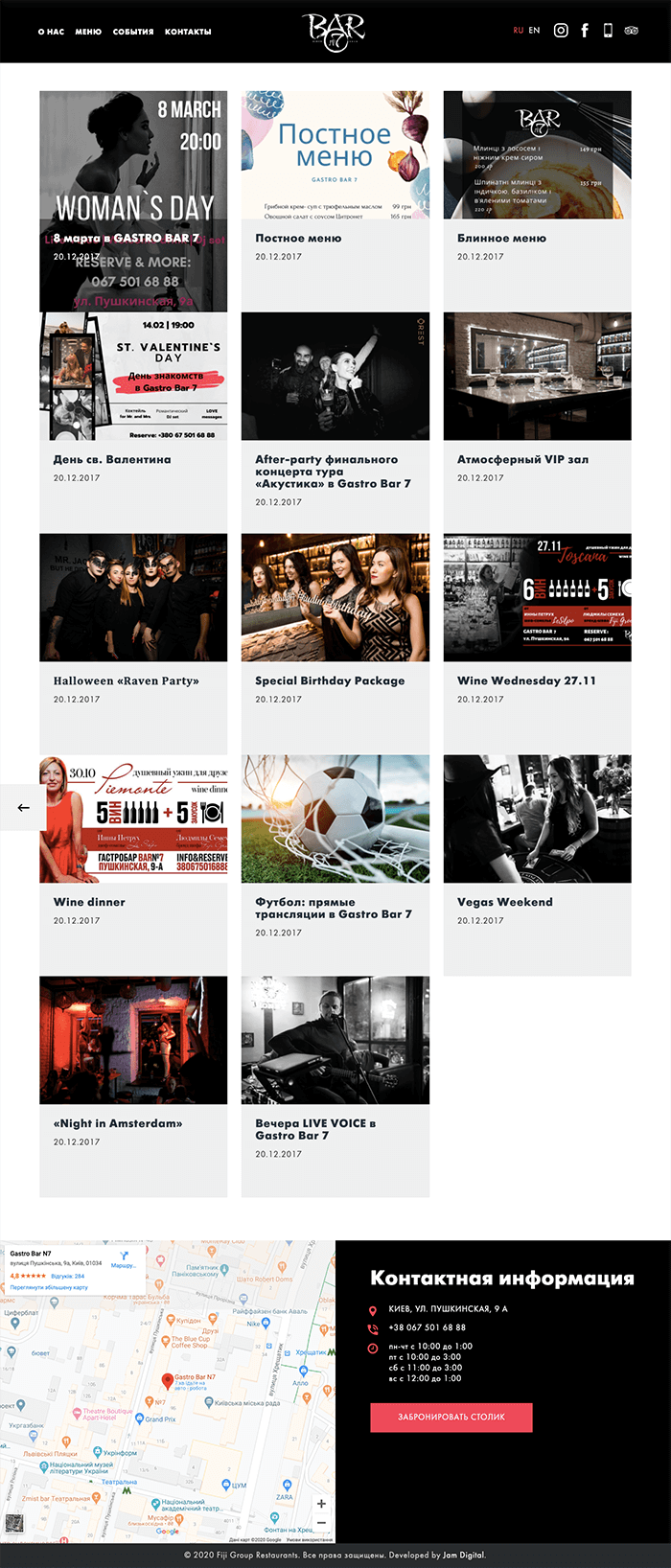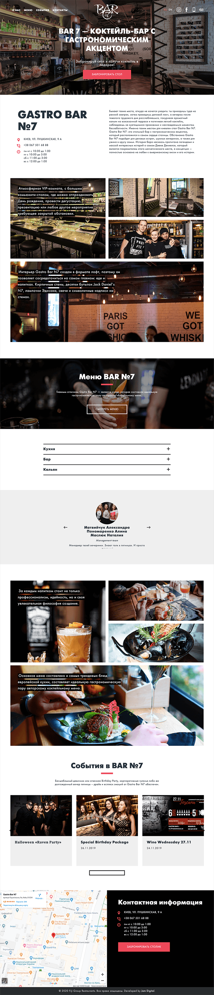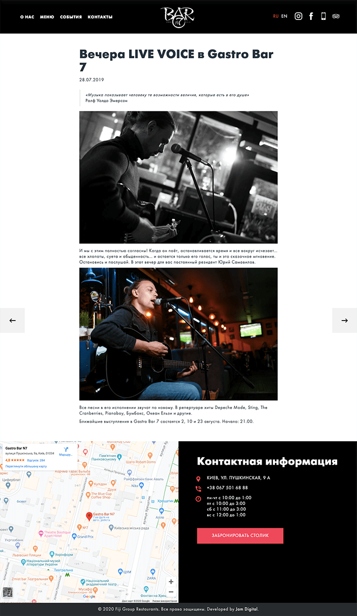 Веб-студія Jam Development займалася розробкою сайту, його дизайном і наповненням. Сайт створено у вигляді landing page з додатковими розділами «Меню» і «Події». Дизайн і верстка сторінок зроблені за принципом mobile first. Сайт реалізовано на CMS WordPress і зроблено в двох мовних версіях — російській та англійській.