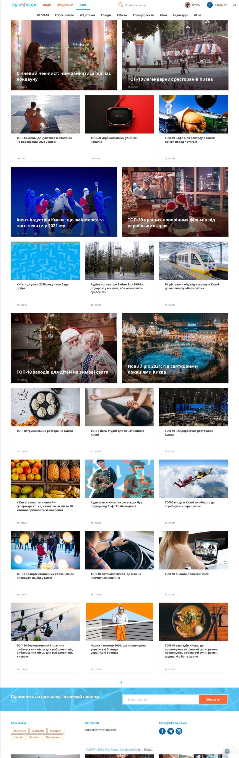 За понад 3 роки існування завдяки команді Jam Development портал зайняв найвищі позиції в Google по запитам “куди піти в Києві”, “що робити в Києві” тощо. Наша редакція порталу постійно слідкує за актуальністю афіші, розвиває популярний Telegram-канал Kyivmaps, модерує додану користувачами інформацію, відбирає та допомогає упаковувати послуги дозвілля для маркетплейсу. Кyivmaps має власне API та автоматично передає інформацію з афішою Києва в міський додаток «Київ Цифровий».
