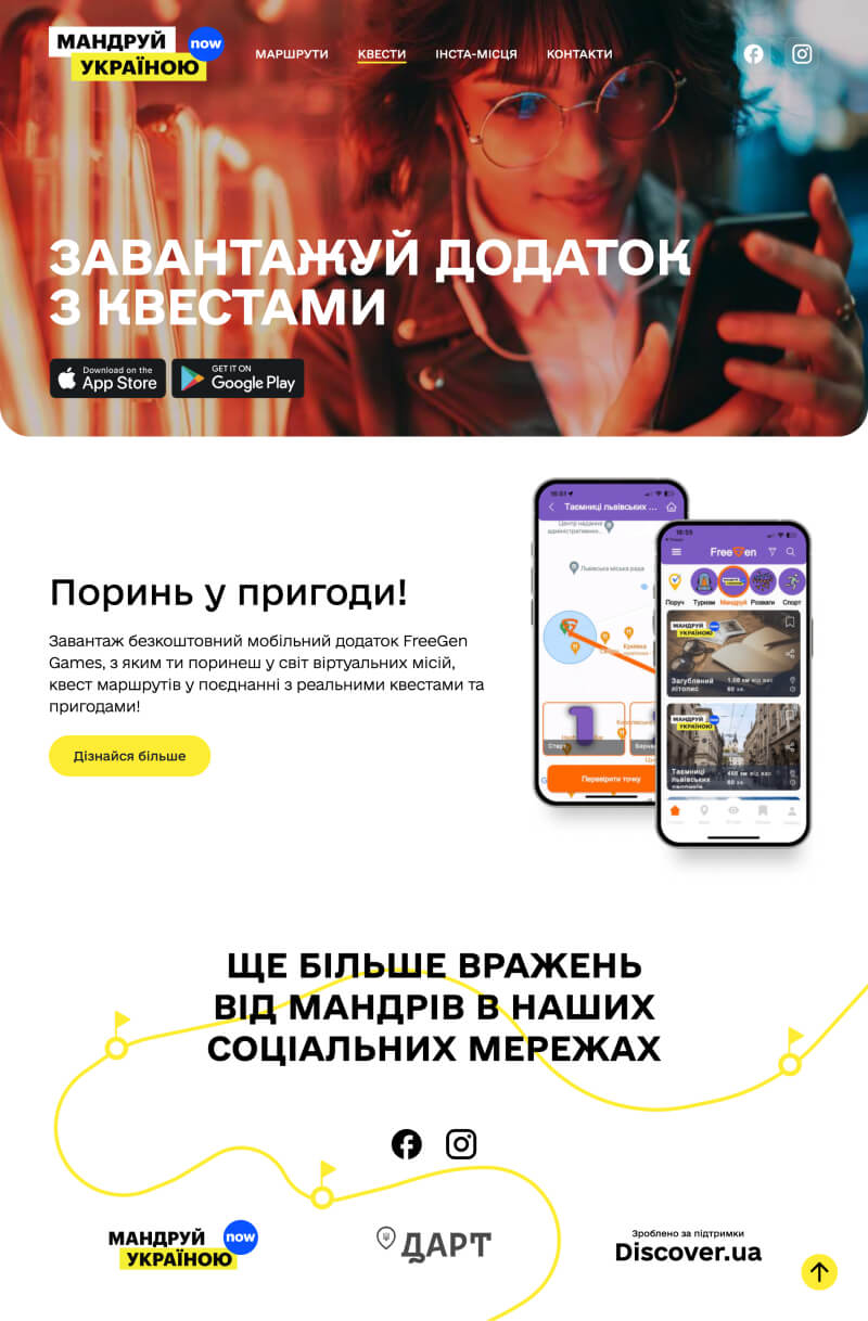 На “Мандруй Україною” вас чекають захопливі маршрути, неймовірні квести та казкові інста-місця, які залишать незабутні враження. Ви зможете не лише ознайомитися зі списком цікавих місць, але й спланувати свій власний маршрут, розрахувати час подорожі та отримати детальну інформацію про кожен пункт маршруту завдяки інтеграції з Google Maps.