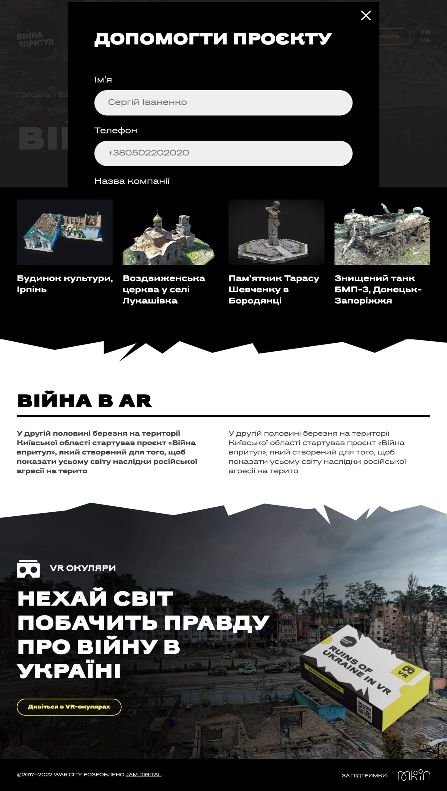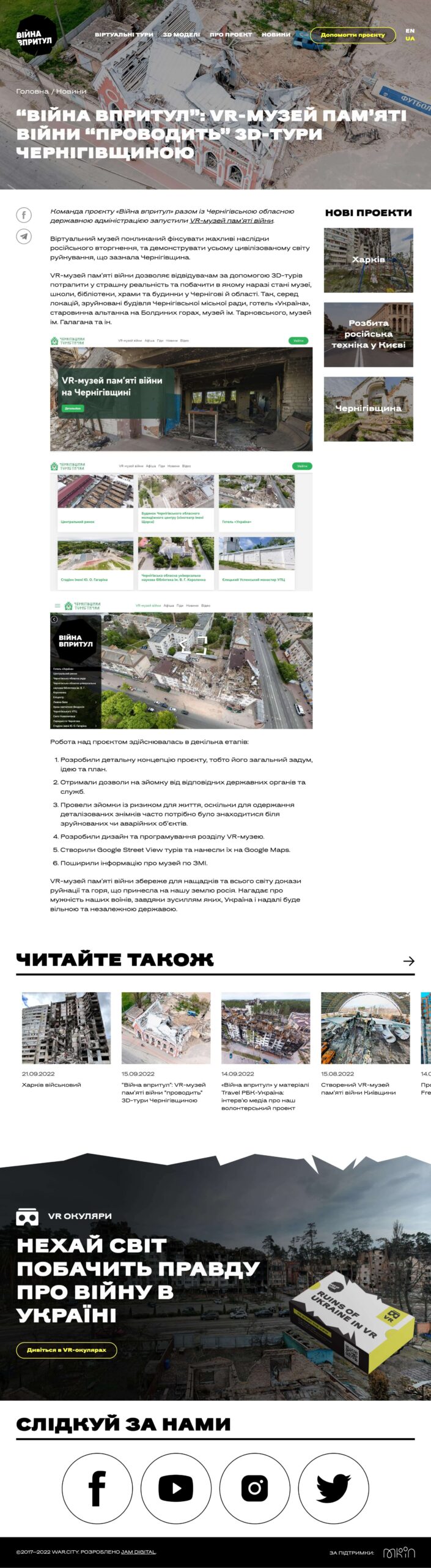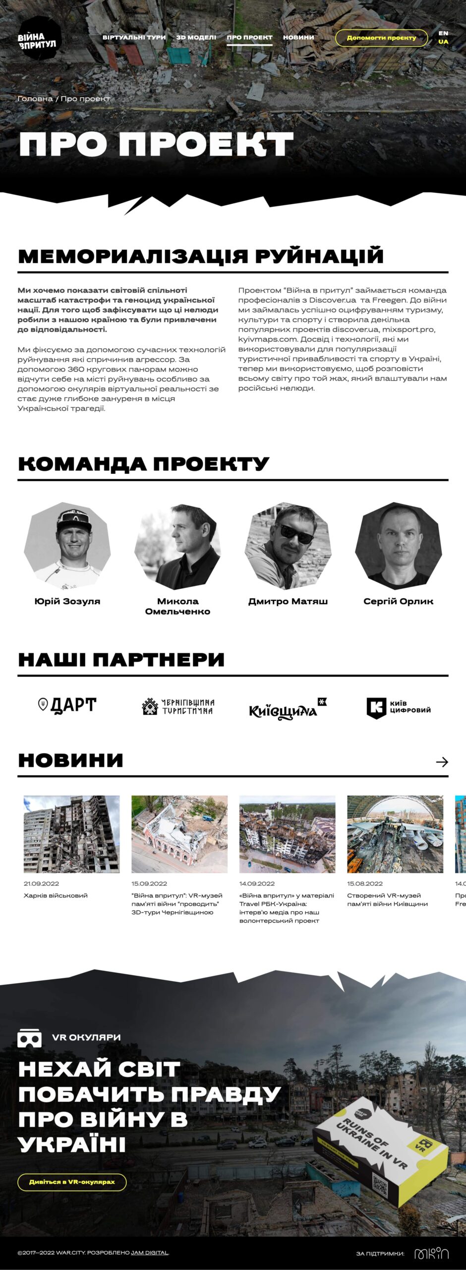 Jam Development внесли свою частину у велику справу, розробивши айдентику для проекту та створивши платформу, на якій відвідувачі можуть дивитися контент «Війна впритул» з максимальним зануренням у реальність. Командою було створено віртуальні тури та 3D-моделі зруйнованих будівель. Сайт реалізований за допомогою CMS WordPress та має статичні розділи, блог та окремо VR-музей війни, доступний для перегляду у VR-окулярах. Для залучення більшої аудиторії платформа має українську та англійську версії.
