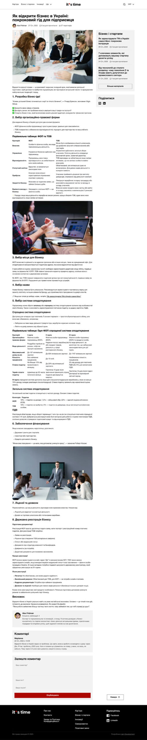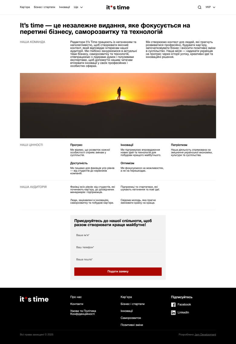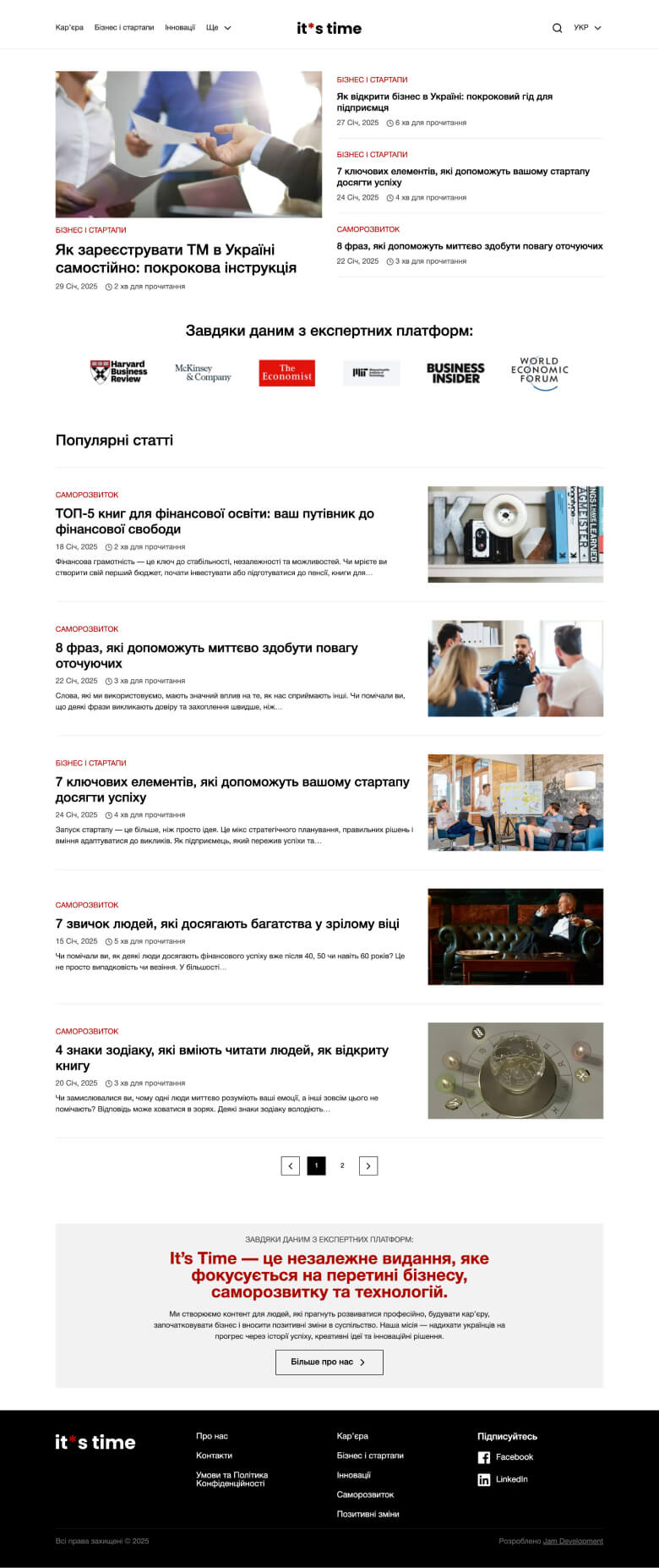 The It’s Time project is an inspiring online magazine developed for the Ukrainian media holding Discover Media Group. This platform motivates Ukrainians to transform themselves, their surroundings, and their country. The magazine’s mission is to inspire progress through success stories, innovative ideas, and creative solutions. It is designed for those who strive for professional growth, build careers, start businesses, and bring positive changes to society.