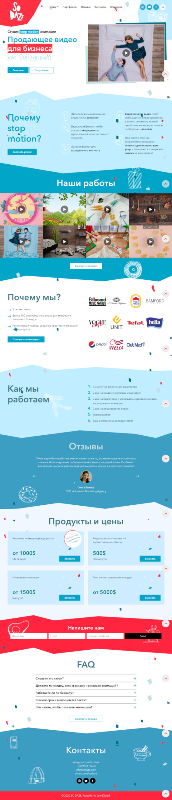 On the site, customers will learn the necessary information about the studio: services provided, reviews, contacts and the process of creating animation. The “Portfolio” section contains video works of the studio, which are organized by topic. The “Products and Prices” section allows you to find out the type of services and their cost, as well as immediately leave a request for an order. At the end of the landing there is a FAQ block with answers to the most popular questions.